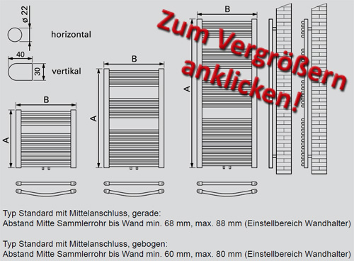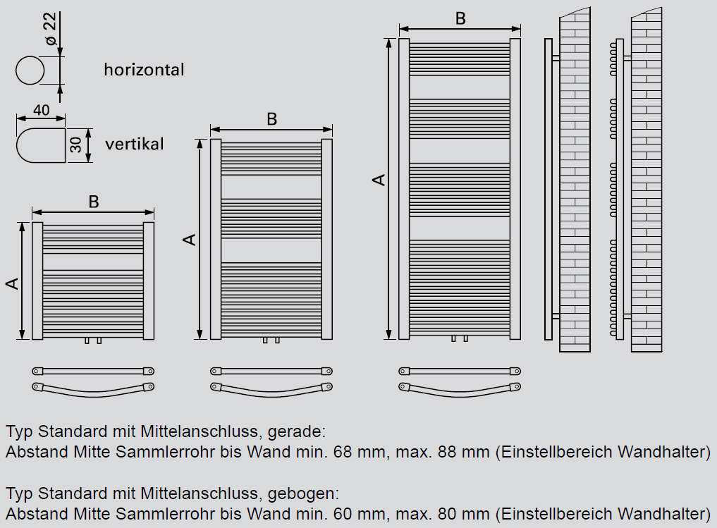 - Badheizkörper Typ Standard: mit geraden oder gebogenen Horizontal-Rundrohren (Ø 22 mm), Bauhöhe: 691, 1186 und 1726 mm, Baulänge: 500, 600 und 750 mm